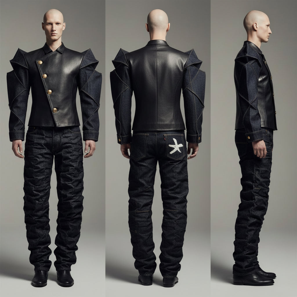 A one-of-a-kind piece inspired by life, music, and culture, where rugged denim spikes and armor meet sleek, embroidered black leather - where chaos and control collide. In a world of constant noise, endless change, and things beyond our control, the only mastery we can claim is over ourselves - how we live, the choices we make, and the moments we